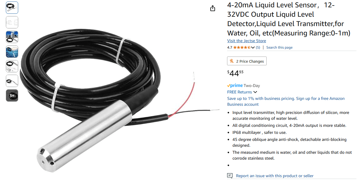 There are many ways to measure the depth of a column of water. The most common method is pressure. If you can measure the pressure at the bottom of the water and compare that to the ambient air pressure, you can determine the depth of the water. Early on in the project, we selected a submersible pressure sensor, easily be sourced on Amazon, that only cost about $35, a very low price for a decent pressure transducer. Early tests were quite positive, so we went ahead and ordered all of the sensors that we needed.